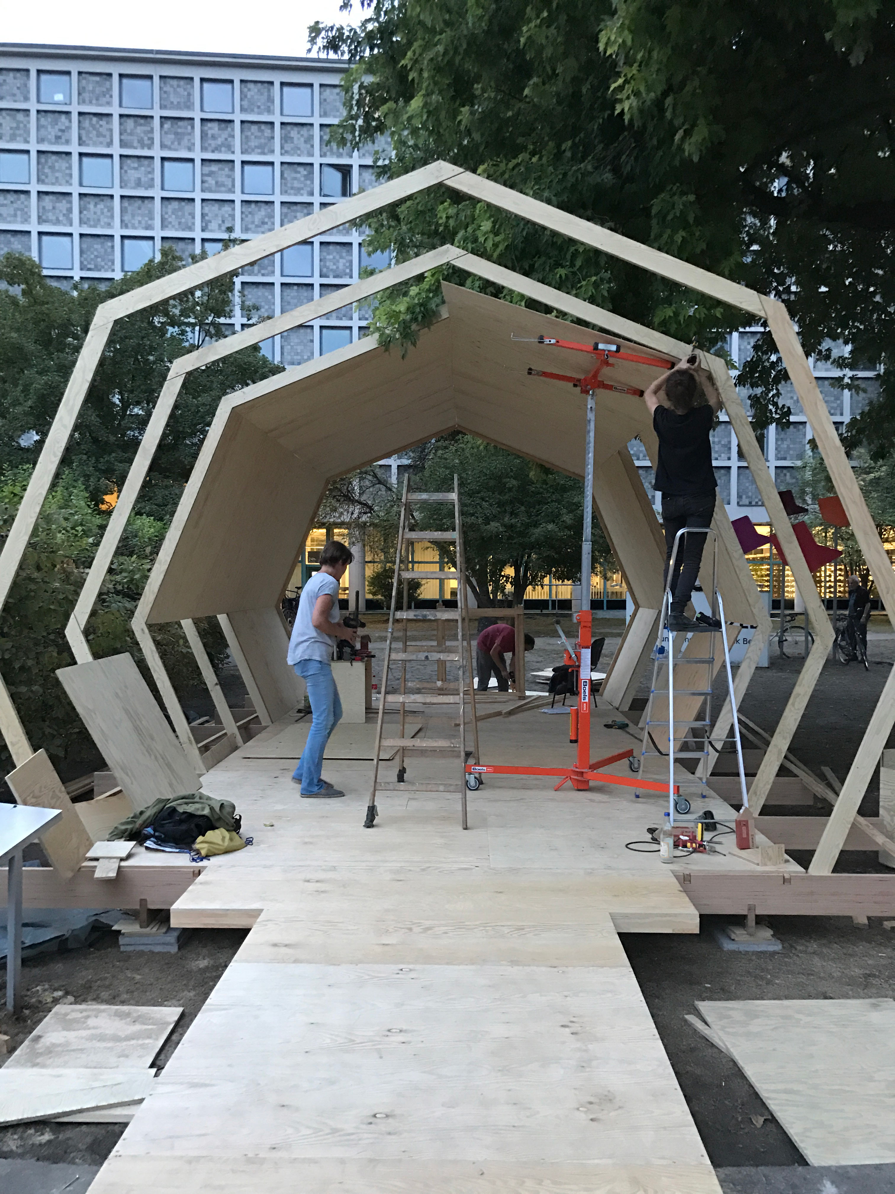 For a library conference, Raumlabor Berlin designed a temporary scaffolding structure with 11 wooden workshop spaces. As a freelance team member, I worked on the seven-week construction phase and led the building of two pavilions, translating the designs into detailed technical planning and execution.